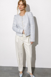 Классические укороченные брюки со стрелками (приобрести жакет с фото можно по арт. 6756, 6788). Детали: брюки на притачном поясе со шлевками, передние половины с небольшими мягкими складками и заутюженными стрелками, застежка на молнию и пуговицу, боковые карманы. Длина брюк по боковому шву с поясом около 98 см в размерах 40-46 и около 99,5 см в размерах 48-52. Длина по внутреннему шву около 71,5 см.