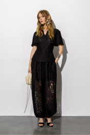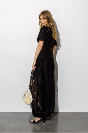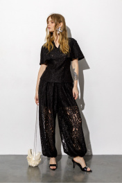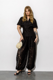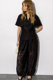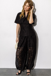Кружевные широкие свободные брюки-алладины (приобрести блузу с фото можно по арт. 6742). Детали: брюки с высокой посадкой на притачном эластичном поясе, без застежки, боковые карманы, низ брюк с эластичными манжетами, на подкладке. Длина по боковому шву с поясом около 108 см, длина по внутреннему шву около 75 см