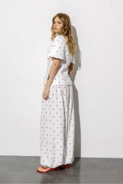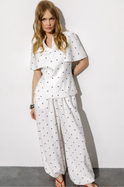Широкие свободные брюки-алладины из вискозы в горохи (приобрести блузу с фото можно по арт. 6775). Детали: брюки с высокой посадкой на притачном эластичном поясе, без застежки, боковые карманы, низ брюк с эластичными манжетами, на подкладке. Длина по боковому шву с поясом около 108 см, длина по внутреннему шву около 75 см