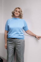 Джемпер женский,второго слоя одежды,прилегающего силуэта с коротким рукавом-реглан.Круглый вырез горловины закеттлеван бейкой-ластик 1х1 высотой в гот. виде 4,0см+-0,5см ( двойная полукетлевка). Низ стана и рукавов заработан ластиком 1х1 высотой в гот. виде 6,0+-0,5 -стан,6,5см+-0,5-рукав.По краю рукава проложена "Новинка" 110т.