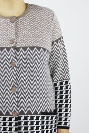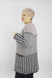 Жакет второго слоя одежды, с длиным втачным рукавом. Круглый вырез горловины обработан бейкой. На переде накладные карманы. Центральная застежка на петли и пуговицы, с цельновывязаным подбортом