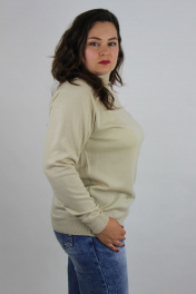 Свитер прямого силуэта, второго слоя одежды, с длиным рукавом реглан. Круглый вырез горловины обработан высоким ластичным воротником-ластик1х1.Низ стана и рукавов заработан ластиком 1х1
