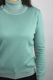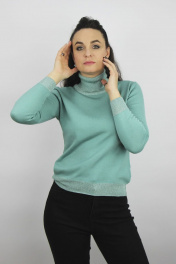 Свитер женский,второго слоя одежды,регулярный, с длинным втачным рукавом. Круглый вырез горловины обработан высоким ластичным воротником-ластик1х1(50% выкл. игл) высотой в готовом виде 16см+-1,0см.