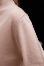 Свитер женский ,второго слоя одежды, с длинным втачным рукавом. Низ изделия и рукавов заработан ластиком 1х1, высотой в готовом виде 4,5см+-0,5см(станы),5,0+-0,5см (рукава). Воротник - двойная ластичная стойка 6,0см+-0,5см в готовом виде, полукеттлевка. По краю низа рукава проложена пряжа полушерстянная высокорастяжимая "Новинка" 110т