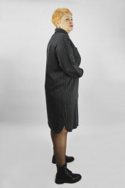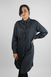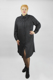 Платье прямого силуэта, с длинным рубашечным рукавом на притачной двойной манжете, с кнопкой. Спинка с горизонтальной кокеткой,Перед с накладными карманами, верх подогнут, с прокладыванием отделочной строчки 3,5 см. Воротник рубашечный, стояче-отложной. Боковые срезы по низу закруглены, с прокладыванием отделочной строчки, одновременно с подгибом низа изделия. Застежка центральная на кнопки. Количество кнопок - 10+1 шт.