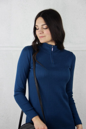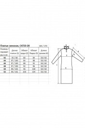 Платье полуприлегающего силуэта, заужено книзу, с длинным втачным рукавом. Вырез горловины обработан двойным притачным воротником. Застежка-молния. Срез под молнию обработан прикеттлеваными бейками - сдвоенная кулирная гладь, выс. в г.в. 0,9+-0,1 см. Низ стана и рукава обработан на спецмашине с высоким подгибом: рукав - 3,0 см., стан - 4,0 см.