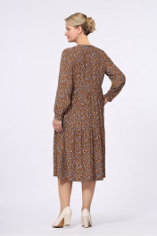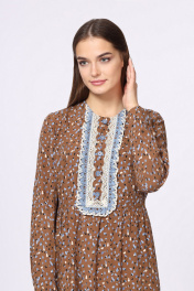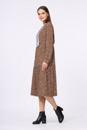 Платье женское полуприлегающего силуэта, длиной ниже колена. Перед с нагрудными и талиевыми вытачками. По центру переда настрочена кружеваная тесьма. Спинка со средним швом и застежкой на одну петлю и одну пуговицу. Нижняя часть платья состоит из двух ярусов со сборкой. Рукав втачной одношовный внижу обработан манжетой. Вырез горловины округлый. Карманы обработаны в боковых швах.