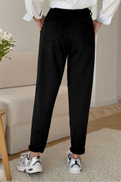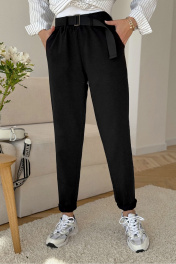 Брюки женские из трикотажной хлопковой ткани (двунитка), слегка заужены к низу. В боковых швах расположены карманы. По низу передних половинок есть защип. Задняя половинка брюк с отрезной кокеткой и накладными карманами. Вверх брюк обработан поясом с резинкой (без молнии). ПОЯС ВХОДИТ В КОМПЛЕКТ. Промеры на примере 44 размера: ОТ 64 см (резинка в свободном состоянии), ОТ 84 (резинка в растянутом состоянии), ОБ 106 см. Ширина под ягодицей: 32 см. Ширина брючины по низу 16 см. Длина по боковому шву с учетом пояса 101 см.