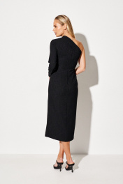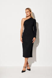 Фактура: шершавая, с отблеском. Ткань: плательно-костюмная. Силуэт: прилегающий. Рукава: длинный, втачной. Застежка: потайная молния в левом боковом шве. Конструктивные элементы: открытое правое плечо и рука, вытачки, средний шов по спинке, разрез по левой части переда. Подкладка: нет.