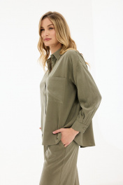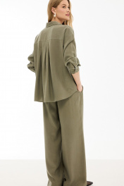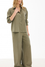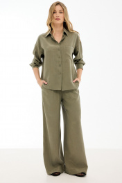 Блузка: Фактура: гладкая. Ткань: блузочно-плательная. Силуэт: прямой. Воротник: рубашечный. Рукава: длинные. Застежка: планка на петли и пуговицы. Конструктивные элементы: манжеты на петли и пуговицы, планки на разрезах рукавов, накладной карман по левой детали переда. Брюки: Фактура: гладкая. Ткань: блузочно-плательная. Силуэт: прямой. Карманы: наклонные к боковым швам. Конструктивные элементы: отрезной пояс на эластичной тесьме. Тип посадки: высокая.