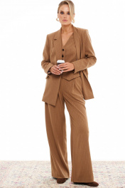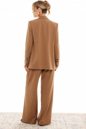 Жакет: Фактура: гладкая. Ткань: костюмная. Длина: ниже линии бедер. Силуэт: прямой. Рукава: втачные длинные. Воротник: пиджачный. Карманы: по переду прорезные с клапанами и двумя обтачками. Застежка: двубортная на петли и пуговицы. Конструктивные элементы: рельефы по переду и спинке, средний шов по спинке, локтевые срезы заканчиваются закрытыми шлицами с декоративными пуговицами. Подкладка: есть.