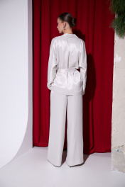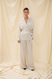 Жакет прямого силуэта, длиной выше линии бедер, из плательно-костюмной ткани. Воротник пиджачный, застежка двубортная на пришивные кнопки, рукава цельнокроеные длинные. Пояс съемный. Брюки прямые, посадка высокая, длинные, из плательно-костюмной ткани. По передним половинкам наклонные карманы. Пояс с эластичной тесьмой.