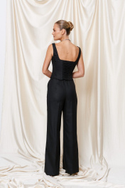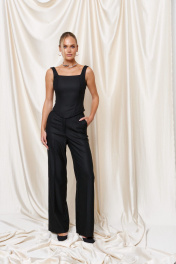 Топ облегающего силуэта с ассиметричным низом из костюмной ткани. По переду и спинке рельефы, на бретелях, сзади на завязках через навесные петли.