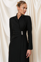 Платье полуприлегающего силуэта, длиной миди, из плательно-костюмной ткани. По переду сборка от плечевого шва, правый край борта с защипами в области талии, по левой детали переда талиевая вытачка. По спинки средний шов, талиевые вытачки, кокетка. Цельнокроеная стойка, застежка от защипов по переду на навесные петли и пуговицы. Рукава трехшовные, реглан. На подкладке.