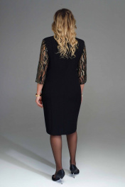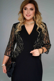 Женское платье полуприлегающего силуэта, выполненное из ткани костюмно-плательного ассортимента. Отделочным материалом служит кружево с пайетками на сетке. По переду платья есть фигурные рельефы из плечевого шва, которые ограничивают бочки, визуально заужающие линию талии. Бочки выполнены из отделочной ткани, которая накладывается на основную ткань. Вырез горловины V-образный, имитирующий запах. На нижних отрезках рельефов есть пришивные пуговицы (4 штуки), которые также служат декором. Рукава втачные, выполненные из отделочной ткани. Спинка с вертикальными рельефами и средним швом спинки, в котором располагается застежка на потайную тесьму-молнию. Длина рукава 45 см. Длина платья по среднему шву спинки от линии горловины 103 см.