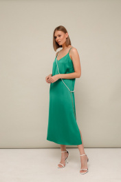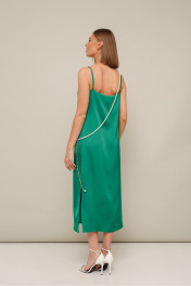Платье-комбинация полуприлегающего силуэта из струящейся ткани с благородным матовым блеском. Перед с нагрудными вытачками. В боковых швах по низу обработаны высокие разрезы. Бретели регулируются по длине. В комплекте к платью прилагается жемчужная цепочка. Платье без подкладки.