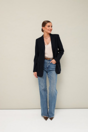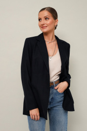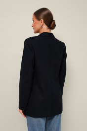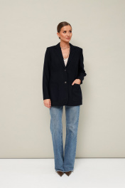 Стильный жакет полуприлегающего силуэта, выполнен из полушерсти. Воротник пиджачного типа с отложными лацканами. Застежка центральная на петли и пуговицы. Спереди обработаны накладные карманы, в области груди подрезы с нагрудными вытачками. Спинка с рельефами и средним швом, переходящим в шлицу. Рукава втачные двухшовные, на левом рукаве декоративная нашивка. Изделие на подкладке.