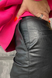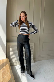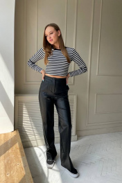 Брюки прямые, из мягкой экокожи, не твердой, не трещит. С изнаночном стороны брюки обработаны хлопковой подкладкой. Длина брюк 119 см. По бокам карманы, застегиваются на молнию и пуговицу спереди, сзади нефункционирующие декоративные карманы.