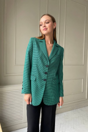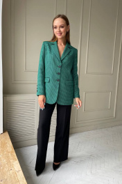 Костюм состоит из жакета и брюк. Костюм выполнен из костюмной ткани. Жакет прямого силуэта, на подкладке. Горловина V-образной формы. Спинка со средним швом. Рукав длинный, втачной. Брюки прямые, по бокам карманы. Брюки на притачном поясе. Застежка по поясу на петлю и пуговицу. Жакет. Длина 74 см.,рукав 62 см. Брюки.Длина 110 см.Талия 69/73/77/81 см.ОБ 94/98/102/106 см.