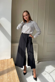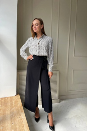 Комплект двойка: блузка и брюки-кюлоты. Блухка прямого кроя, застегивается на пуговицы, из шифона,длина 67 см, рукав 62 см. Стильные брюки на запах, длина 91 см. По верху брюки на притачном поясе с центральной застежкой на молнию. Правая брючина формирует запах с застежкой на полукольца. В боковых швах карманы.