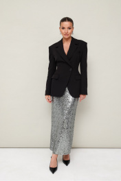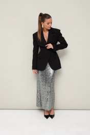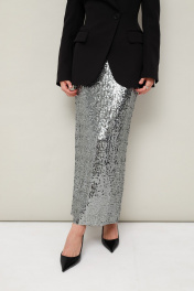 Прямая юбка из велюра с пришитыми во верху пайетками. Пояс юбки на резинке. Юбка на подкладке, сзади разрез для свободы движения