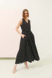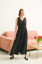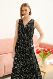 Элегантное летнее женское платье полуприлегающего силуэта расклешенное к низу из плательной ткани. Прилегание достигается за счет кулисы со шнуром, расположенной по линии талии. Платье без рукава с V-образной горловиной.