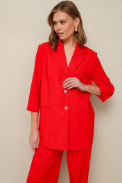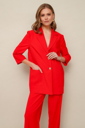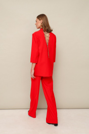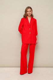 Стильный комплект, состоящий из жакета и брюк. Жакет современного прямого силуэта из костюмной ткани с центральной застёжкой на петли и пуговицы. Воротник пиджачного типа с отложными лацканами. Спереди обработаны накладные карманы. Спинка с V-образным вырезом, который зашнурован акцентной декоративной тесьмой. Рукава втачные, длина 3/4. Изделие на х/б подкладке. Брюки прямого силуэта из костюмной ткани с заутюженными стрелками.