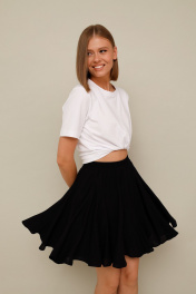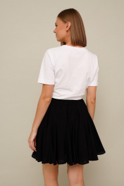 Трендовый комплект, состоящий из хлопкового джемпера и мини-юбки. Футболка прямого кроя со слегка спущенной линией втачивания плеча. Округлый вырез горловины. Рукава втачные короткие. Эффектная мини-юбка А-образного силуэта, за счет втачных клиньев разной высоты. Притачной пояс на резинке, со строчками.