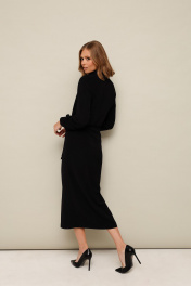 Платье отрезное по линии талии, полуприлегающего кроя, выполнено из плательной струящейся ткани. Горловина с рубашечным воротником на притачной стойке. Лиф с центральной застежкой на потайную планку на петли и пуговицы. По талии обработана резинка для регуляции размера. Юбка с имитацией запаха с застежкой на притачной пояс из основной ткани, который фиксируется на бант. Рукава длинные с притачной манжетой с застежкой на пуговицы.
