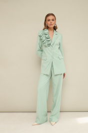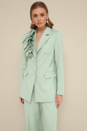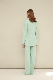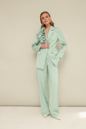 Эффектный 2-предметный комплект, состоящий из жакета и брюк, выполненный из костюмной ткани. Жакет женский полуприлегающего силуэта с центральной застежкой на петли и обтяжные пуговицы. Воротник пиджачного типа с отложными лацканами. Спереди обработаны прорезные карманы в рамку с клапанами. Рукава втачные двухшовные. Спинка со средним швом и рельефами. Изделие обработано подкладкой. Брюки прямого силуэта с заутюженными стрелками и с боковыми наклонными карманами. Пояс притачной с застежкой на пуговицу и тесьму-молнию, по спинке пояс на резинке для регуляции размера. В комплекте прилагается съемная брошь из основной ткани.