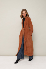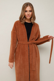 Женский кардиган прямого кроя, выполнен из мягкого пушистого трикотажного полотна. Горловина спинки и борта обработаны притачной планкой. Длинные рукава со спущенной линией втачивания плеча, по низу обработана манжета. В боковых швах внутренние карманы. В комплекте прилагается пояс из основной ткани.