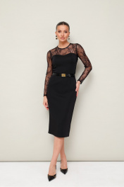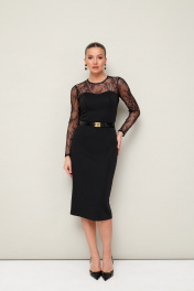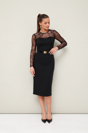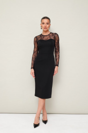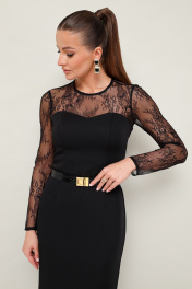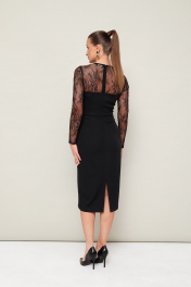 Платье-футляр прилегающего силуэта, отрезное по линии талии, в длине миди. Горловина округлая, вырез лифа фигурной формы с рельефами. Лиф и юбка выполнены из плательно-костюмной ткани. Рукава, кокетка лифа и спинки выполнены из кружевного полотна. Рукава длинные втачные. Акцентом платья является съемный воротничок, который застегивается на потайные пуговицы и навесные петли. Застежка на потайную тесьму-молнию в среднем шве спинки. Для удобства движения в нижней части юбки обработан разрез.