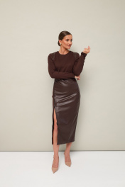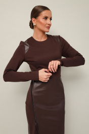 Стильное платье прилегающего силуэта, отрезное по линии талии, выполнено из экокожи и трикотажного полотна. Горловина округлой формы. Длинные втачные рукава. Юбка спереди с подрезом на металлическую молнию, с возможностью регулировать высоту разреза. Застёжка по спинке в среднем шве на потайную молнию.