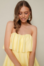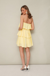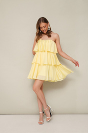 Коктельное ярусное платье в длине мини, выполнено из воздушной вискозной ткани. Лиф с фигурным вырезом линии декольте и с корсетными чашками. По спинке обработана потайная застежка на резинку с крючками, для комфортного прилегания лифа по линии груди. В среднем шве спинки застежка на потайную молнию. Платье на подкладке. В комплекте прилагаются силиконовые бретельки.