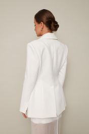 Силуэтный жакет с подчеркнутой линией талии. Смещенная застежка на петлю и пуговицу. Воротник пиджачного типа с отложными лацканами, край борта скругленный по низу жакета. Спереди обработаны прорезные карманы в рамку с клапанами и нагрудный прорезной карман с листочкой. Рукава втачные, двухшовные с отлетнымм шлицами. Спинка с рельефами и средним швом, переходящим в шлицу. Изделие на подкладке.