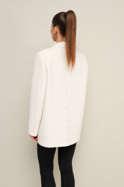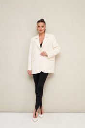 Жакет актуального прямого кроя, выполнен из костюмной ткани. Воротник пиджачного типа с отложными лацканами, край борта скругленный по низу жакета. Спереди обработаны прорезные карманы в рамку с клапанами. Рукава втачные двухшовные со шлицей и пуговицами. Спинка со средним швом, переходящим в высокую шлицу с застежкой на петли и пуговицы. Жакет на подкладке.