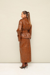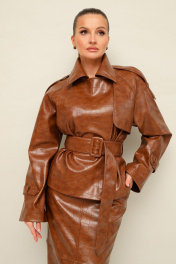 - ОписаниеСтильный 2-предметный комплект, состоящий из жакета и юбки, выполненный из экокожи. Жакет современного прямого силуэта, двубортный с застежкой на петли и пуговицы. По плечевому шву обработаны погоны. Воротник пиджачного типа с отложными лацканами. Спереди отлетная кокетка. Рукава кроя реглан, с патами по низу, с фиксацией на пряжки. Спинка со средним швом. Изделие на подкладке. В комплекте пояс из основной ткани с пряжкой. Юбка на подкладке в длине миди с боковыми наклонными карманами. Притачной пояс с застежкой в среднем шве на потайную молнию. Для удобства движения сзади обработана шлица.