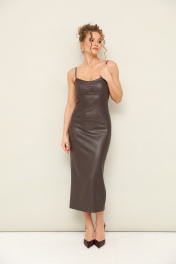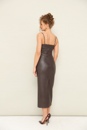 Платье на бретельках прилегающего силуэта, выполнено из фабричной экокожи. Вырез горловины фигурный. Лиф платья с чашками. Застёжка по спинке в среднем шве на потайную молнию. Для удобства движения сзади обработан разрез.