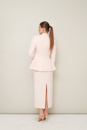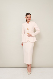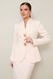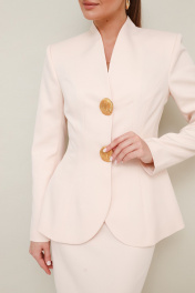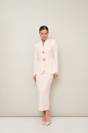 Стильный 2-х предметный комплект, состоящий из жакета и юбки, выполненный из костюмной ткани. Жакет прилегающего силуэта, слегка расширенный к низу. Горловина с цельнокроеной стойкой и V-образным вырезом. Центральная застёжка на потайные пришивные кнопки с декоративными акцентными пуговицами. Рукава втачные, двухшовные. Спинка с рельефами и средним швом. Юбка в длине миди, пояс на обтачке, застежка в среднем шве по спинке на потайную молнию. Для удобства движения сзади обработана шлица. Жакет и юбка на подкладке. Фурнитура, акцентные пуговицы могут отличаться от фото!