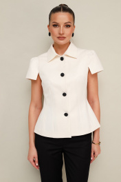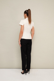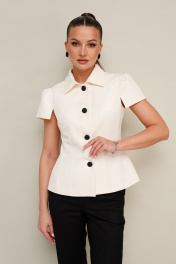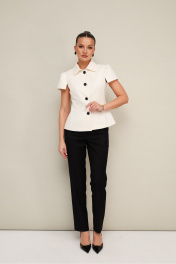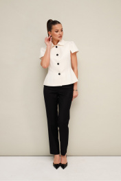 Комплект 2-х предметный, состоящий из жакета и брюк, выполненный из костюмной ткани. Жакет полуприлегающего силуэта, с центральной застежкой на петли и пуговицы. Отложной воротник со стойкой. Рукава короткие с вытачками по окату и разрезами по низу. Жакет на подкладке. Брюки прямого силуэта слегка зауженные к низу, с заутюженными стрелками и с боковыми наклонными карманами. Застежка на пуговицу и молнию. Притачной пояс на резинке для комфорта и регуляции размера.