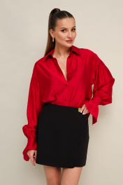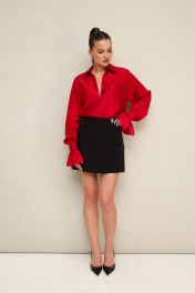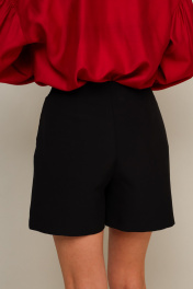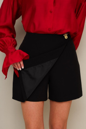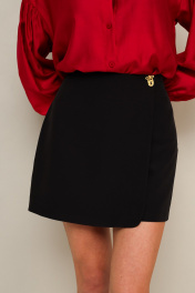 Юбка-шорты в длине мини, выполнена из костюмной ткани. Спереди имитация юбки на запах с застежкой на акцентную пуговицу. Основная застёжка в боковом шве на потайную молнию.