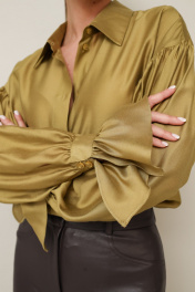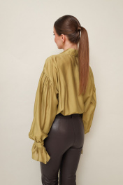 Акцентная блузка прямого кроя, выполнена из натуральной невесомой ткани с матовым блеском. Горловина с рубашечным воротником на отрезной стойке, центральная застежка на петли и пуговицы. Рукава со спущенной линией втачивания плеча, манжеты с рюшей с застежкой на навесные петли и пуговицы.