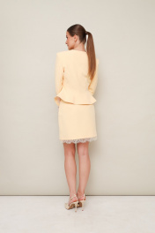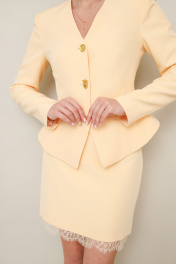 Комплект, состоящий из жакета, юбки и шарфа, выполнен из костюмной ткани. Силуэтный жакет актуального кроя с V-образным вырезом горловины. Центральная застёжка на петли и пуговицы. Рукава втачные, двухшовные. Юбка в длине мини, на обтачке по поясу, с застежкой на потайную молнию в среднем шве спинки. Низ юбки декорирован французским кружевом. Жакет и юбка обработаны подкладкой.