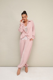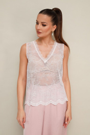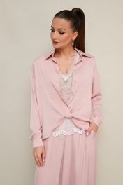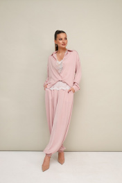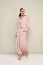 3-х предметный комплект: топ, блузка и брюки-алладины. Элегантная блузка прямого кроя, выполнена из струящейся ткани с благородным матовым блеском. Горловина с рубашечным воротником на отрезной стойке, центральная застежка на петли и пуговицы. Перед блузки выполнен с декоративным перекрутом в низжней части застежки. Рукава со спущенной линией втачивания плеча, манжеты с застежкой на петли и пуговицы. Спинка с отрезной кокеткой и бантовой складкой. Топ прямого силуэта, выполнен из изысканного французского кружева. V-образный вырез горловины обработан кружевной отделкой. Комфортные брюки-алладины свободного силуэта с боковыми наклонными карманами. Притачной пояс и манжеты на резинке.