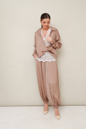 3-х предметный комплект: топ, блузка и брюки-алладины. Элегантная блузка прямого кроя, выполнена из струящейся ткани с благородным матовым блеском. Горловина с рубашечным воротником на отрезной стойке, центральная застежка на петли и пуговицы. Перед блузки выполнен с декоративным перекрутом в низжней части застежки. Рукава со спущенной линией втачивания плеча, манжеты с застежкой на петли и пуговицы. Спинка с отрезной кокеткой и бантовой складкой. Топ прямого силуэта, выполнен из изысканного французского кружева. V-образный вырез горловины обработан кружевной отделкой. Комфортные брюки-алладины свободного силуэта с боковыми наклонными карманами. Притачной пояс и манжеты на резинке.