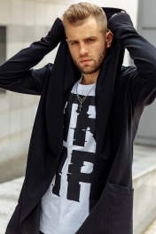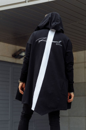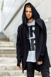 Мантия мужская прямого силуэта рубашечного покроя со спущенной линией плеч. На переде накладные карманы из боковых швов. Карманы фигурные с отделкой из изнаночной стороны ткани. Спинка из трех частей с вертикальной вставкой из контрастного полотна. В верхней части спинки вышивка в тон отделочной вставки. Линия низа ассиметричная. Рукава длинные с манжетой-перчаткой, на левой манжете фирменная нашивка. Горловина обработана объёмным цельнокроенным капюшоном.