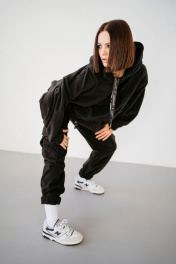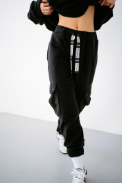 Брюки женские повседневные. Прямого силуэта, в боковых швах карманы. Пояс из основного полотна, регулируемый с помощью тесьмы с фирменным логотипом. Низы брюк с цельнокроенной манжетой и эластичной лентой. По боковым швам брюк накладные карманы с клапаном, застегивающимся на кнопки.