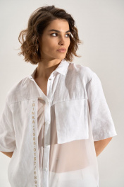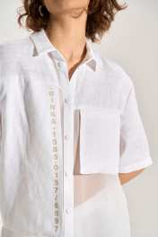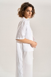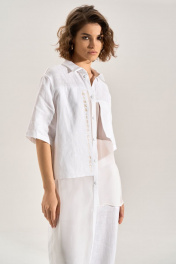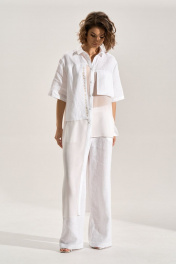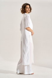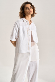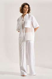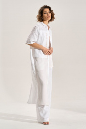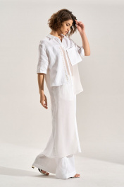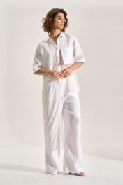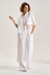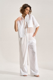 Костюм: блуза + брюки. Блузка свободного силуэта с асиметричными деталями, перед из шифона, правая полочка и спинка удлинены до середины икры, горловина обработана рубашечным воротником, с центральной планкой. Застежка на кнопки. Слева навесной карман, справа отлетная деталь с авторской печатью, спинка с имитацией застёжки на кнопки. Брюки палаццо, В боковых швах карманы , пояс брюк на резнке.