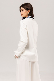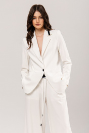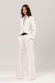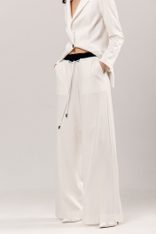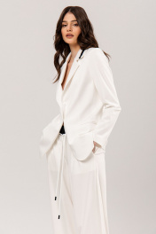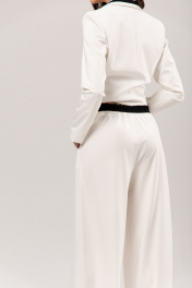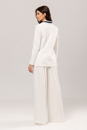 Костюм: жакет+брюки. Жакет приталенного силуэта, на подкладке: •воротник декорирован контрастной бейкой •прорезные карманы •втачной рукав •застежка на пуговицу Брюки палаццо: •по поясу контрастный элемент на резинке, дополнительно регулируется шнуром •в боковых швах карманы