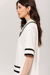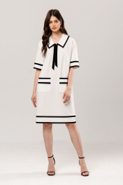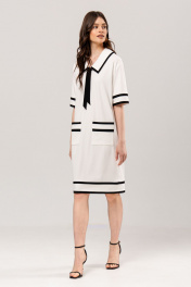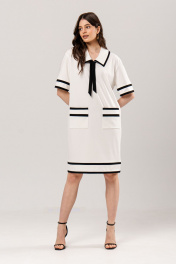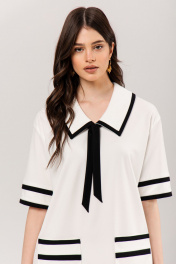 Платье свободного силуэта: •воротник, рукава, карманы и низ декорированы бейкой из отделочной ткани •накладные карманы •в комплекте съемный бант